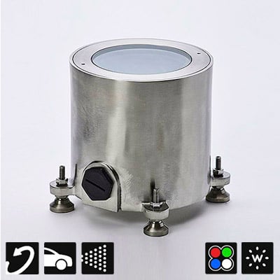 C5X is a wet label, adjustable in-grade or submersible uplight that is 5.75 inches in diameter, and suitable for power washing and submersion using special remote drivers. It is adjustable +/- 10° (total 20°) and is rotatable 120° front and back. It comes in 4 CCTs or RGBW with integral DMX decoder. Driveover rated up to 11,000 lbs.
