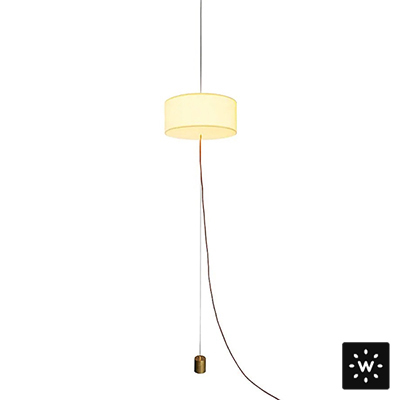 Casa is a unique floor lamp and pendant system, designed by Lazzarini Pickering Architetti, using a steel cable attachment to the ceiling with an iron counterweight placed on the floor. It has a linen lampshade in an ivory finish and uses 2 LED opal bulbs (included). Brown fabric coated electric wire with a dimmer attached.