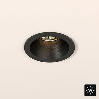Helax 70 Out is an IP54-rated, round, recessed LED downlight suitable for indoor installation on ceilings. It is available in 2 static white temperatures, and textured white or black standard finishes.