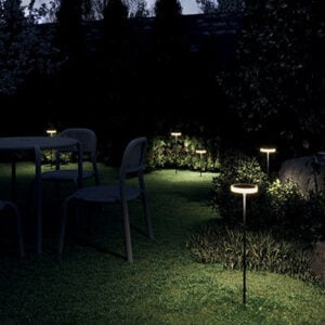 Lila is a refined and discreet bollard with a disc of light placed on a thin, treated, and painted steel stem that comes in 2 different heights. Suitable for outdoor spaces, it can be installed on the surface with a base or in-ground with a spike, and is available in 2 color temperatures with a black finish.