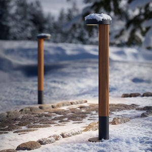 Plin Round Wood is a family of outdoor bollards that combine a body of weather-resistant teak sourced from FSC®-certified plantations with a head and base in 6082 Anticorodal® aluminum in an anthracite finish. It is available in 3 styles – 2 heights each. Plin Round Wood 5.1 is the 23.0” version with a round flat head.