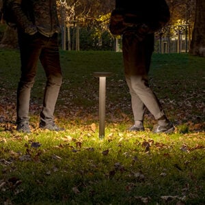 Plin Round Wood is a family of outdoor bollards that combine a body of weather-resistant teak sourced from FSC®-certified plantations with a head and base in 6082 Anticorodal® aluminum in an anthracite finish. It is available in 3 styles – 2 heights each. Plin Round Wood 6.1 is the 23.0” version with a centered, round flat head.