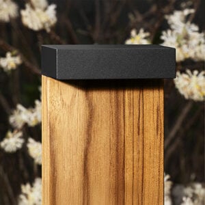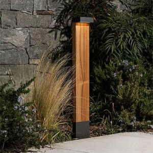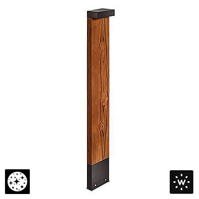 Plin Wood is a family of outdoor bollards that combines a body of weather-resistant teak sourced from FSC®-certified plantations with a head and base in 6082 Anticorodal® aluminum and an anthracite finish. It is available in 3 styles – 2 heights each. Plin Wood 2.2 is the 29.9” version with a flat head.