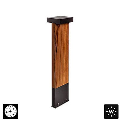 Plin Wood is a family of outdoor bollards that combines a body of weather-resistant teak sourced from FSC®-certified plantations with a head and base in 6082 Anticorodal® aluminum and an anthracite finish. It is available in 3 styles – 2 heights each. Plin Wood 3.1 is the 22.1” version with a square flat head and double beam emission.
