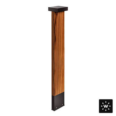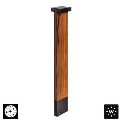 Plin Wood is a family of outdoor bollards that combines a body of weather-resistant teak sourced from FSC®-certified plantations with a head and base in 6082 Anticorodal® aluminum and an anthracite finish. It is available in 3 styles – 2 heights each. Plin Wood 3.2 is the 29.9” version with a square flat head with double beam emission.