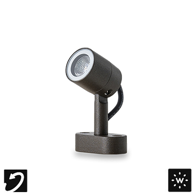 SPY is a versatile outdoor floodlight, also available as a downlight, that comes in three sizes and is 355° rotatable, for fulfilling every lighting situation. It has optics set back from the edge of the main body to allow precision without glare. Also available in a wall or ‘treehugger’ version which can be secured to branches, poles or other supports. Spy 35 is the smallest version with a 1.4” diameter, and 3.5W of power. Dark Sky compliant for output below 80°.